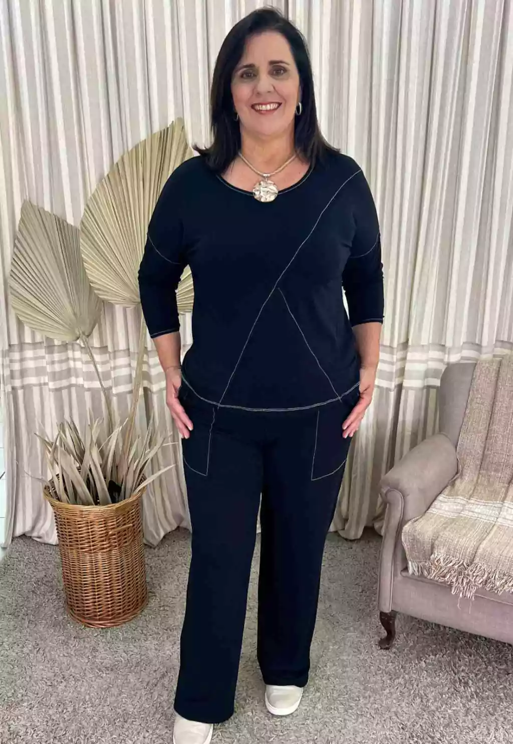 A nossa modelagem é mais ampla que as marcas convencionais. Desta forma, disponibilizamos uma tabela de medidas de acordo com o seu biotipo. Para saber a numeração mais adequada, meça o seu busto, cintura e quadril e consulte a nossa tabela, nas “Informações do Produto”.